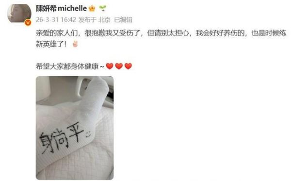 随后,陈妍希在社媒上发文报平安:亲爱的家人们,很抱歉我又受伤了,但请别太担心,我会好好养伤的,也是时候练新英雄了!希望大家都身体健康。