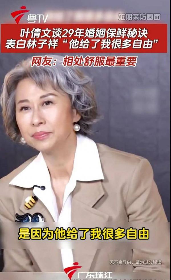 在访问中,叶蒨文坦言,自己之所以会嫁给林子祥,很重要的原因,就是对方给了她很多自由。她说,过去从未遇过一个男朋友,愿意让她放心去做自己喜欢的事。