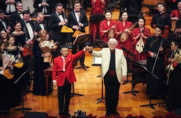 下半场,“和鸣”的理念继续深入。著名指挥家李心草与奥西波夫国立模范民乐团艺术总监弗拉基米尔·安德罗波夫登台执棒,率两支乐团的演奏家奏更深层次的民乐融合:《礼尚·乐合》由中国乐曲《礼尚·乐合》与俄罗斯乐曲《欢迎序曲》编创而成,两国乐团以完整联合编制的形式奏出宏大音响,立住了“和”之基调。联合作品《和鸣》更把俄罗斯名曲《莫斯科郊外的晚上》与中国云南民歌《放马山歌》相融,琵琶的轮指、阮的吟揉与巴拉莱卡琴、多姆拉琴清脆疾速的拨奏交织缠绕,竞相辉映,将两类弹拨乐传统的技艺精髓展现得淋漓尽致。乘着全场的热烈喝彩,家喻户晓的《货郎》《我爱你,中国》把气氛继续推高,返场时,两位指挥家一同上场,热烈的《卡林卡》将这个春夜彻底点燃。