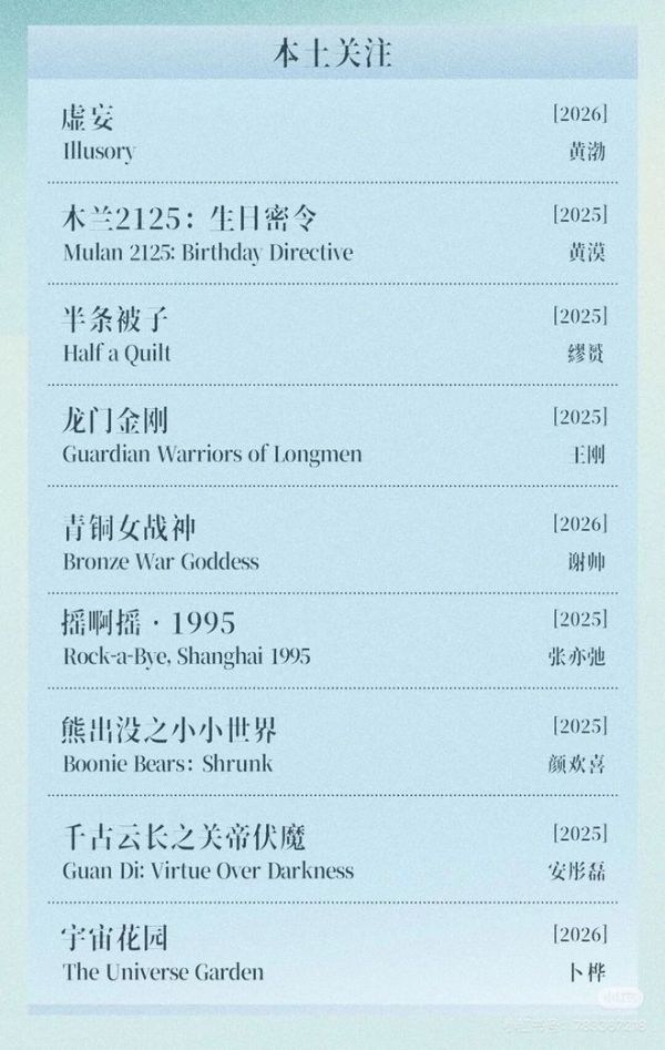 目前,北影节在公布完第一批展映片单后,又陆续公布了完整的天坛奖主竞赛片单(16部)、无界沉浸单元(约50部),剩下的影片主要还包括“注目未来”竞赛单元、短片竞赛单元以及少量第二批展映影片,预计4月8日左右公布。