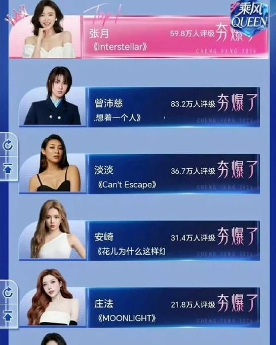 最终结果显示,女星张月以60.1万票的评级人数获得「乘风Queen」,曾沛慈虽获得84万票,但评级人数不等于最后成绩,导致曾沛慈屈居第二名。其实直播结束前,曾沛慈还以63.5万票领先张月的38万票;但最后十几分钟内,张月的票数从45.5万激增至60.1万,被观众质疑合理性。