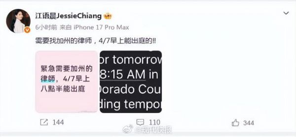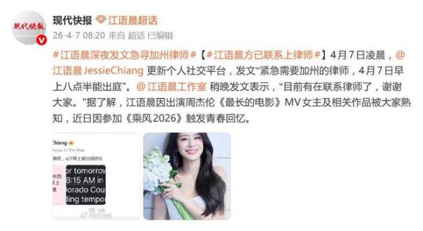 4月7日凌晨,一则紧急求助在社交平台炸开了锅。曾因出演周杰伦《最长的电影》MV女主而为人熟知的艺人江语晨,突然发文求助:“紧急需要加州的律师,4月7日早上八点半能出庭。”消息一出,瞬间引发网友围观和猜测。