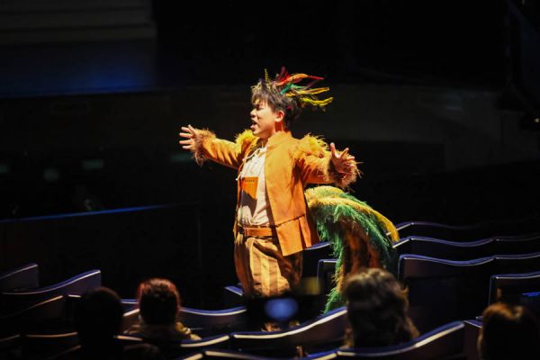 歌剧《魔笛》中的角色“帕帕基诺”正站在观众席中表演。 文汇报记者 叶辰亮摄