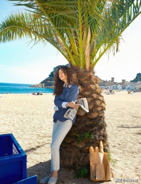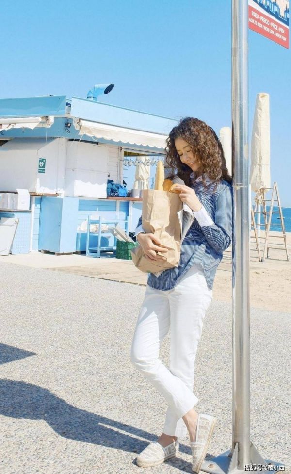 裤型是利落的直筒小脚款,刚好卡在脚踝上方,这样一来,轻轻松松就将纤细的脚踝露出来,视觉上特别显腿长,还能中和上半身衬衫的宽松感,让整体造型张弛有度。白色和蓝条纹的配色清爽又高级,压根就不挑肤色,日常穿也很百搭。脚上所穿鞋子是一脚蹬款式,鞋面带点低调的纹理设计,软乎乎的质感看着就舒服,平底款式走路完全无压力,不管是逛街还是海边散步都合适,和整体的松弛感完美契合。