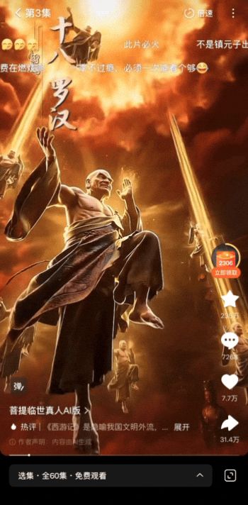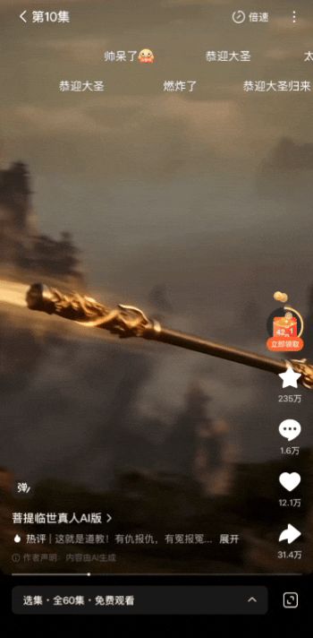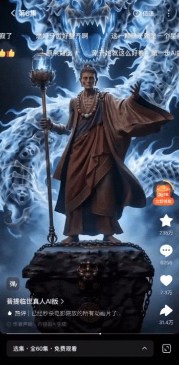 视觉层面的提升同样是其重要支撑。男频神话题材依赖的大场面与视觉奇观,过去一直是传统短剧难以触及的领域,而AI生成显著降低了场景与角色制作门槛。《菩提临世真人AI版》中灵山、天庭与混沌界等宏大空间被高密度呈现,大量战斗场面与特效镜头让整体观感更接近游戏CG或动画风格,这种视觉体验更贴近男频用户审美。