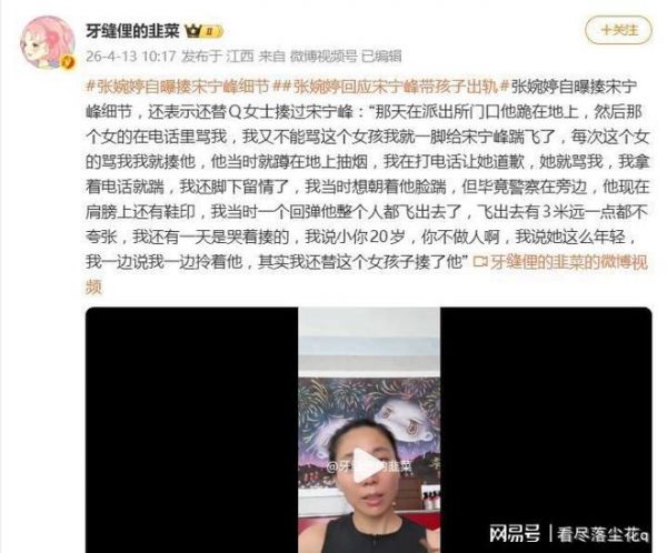 据4月13日网友爆料,张婉婷在直播中详细描述了一段与丈夫宋宁峰的激烈冲突细节,其直白叙述迅速引发网络热议。她自曝曾在派出所门口对宋宁峰动手,还称其实是“替Q女士揍了他”。
