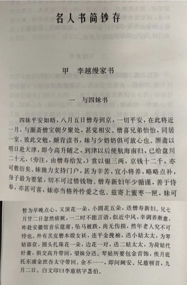 颇具巧合的是,全楙绩当年帮忙带回的这封家书,后来被周作人收藏。1943年,周作人编纂结集《药堂杂文》时,收录了两组尺牍抄录,均为李慈铭、潘祖荫的手书,分别题为《名人书简抄存》与《名人书简抄存二》,其中就包含了当年全楙绩带回的《寄四妹书》——这是李慈铭写给从妹的书信,信中写道:“琴姑所要包金首饰,俟月底托东浦金庶吾太守带回。余不一一,即问阃安。兄慈顿首。九月二日。”此处出现了一处小误差,“全庶熙”被误写为“金庶吾”,至于究竟是出版时的录写失误,还是周作人对全楙绩不够熟悉而致误,如今已难考证。