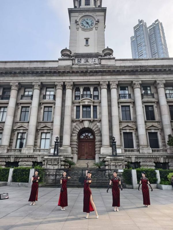 4月16日,武汉江汉关广场,五位身着复古旗袍的舞蹈演员翩翩起舞,舞姿与百年建筑的碰撞,吸引了不少市民与外地游客驻足围观。