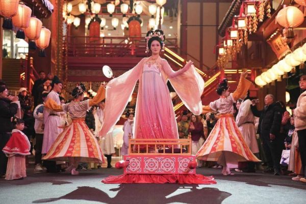 千年古都,诗意长安。2025年起,西安提出打造“唐诗之都”,计划用3年左右时间,推动唐诗文化与民众生活、文商旅发展相融合,建设唐诗山水旅游线路,打造“唐诗之都”文化品牌。如今,在西安许多古迹景点和街头巷尾,唐诗成为可见可感的风景,千年前的诗句,正点点滴滴刻入城市肌理,走进人们的生活。图为在西安长安十二时辰主题街区,演员以唐诗中的杨贵妃为主题进行沉浸式表演。 (新华社记者 邵瑞 2025年12月23日 摄)