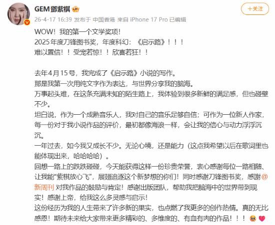 2026年4月17日,华语乐坛歌手邓紫棋在社交平台宣布,其首部长篇科幻小说启示路荣获2025年度刀锋图书奖年度科幻作品。消息发布后引发广泛关注,也标志着她从音乐创作延伸至文学领域的尝试,取得了一次具有实质意义的突破。