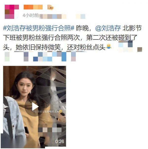 更令人不适的是,他不仅近距离举手机拍摄,还试图伸手搭肩。在推挤过程中,甚至直接撞到了刘浩存的头部。这已经不是“热情”,而是明显的越界。