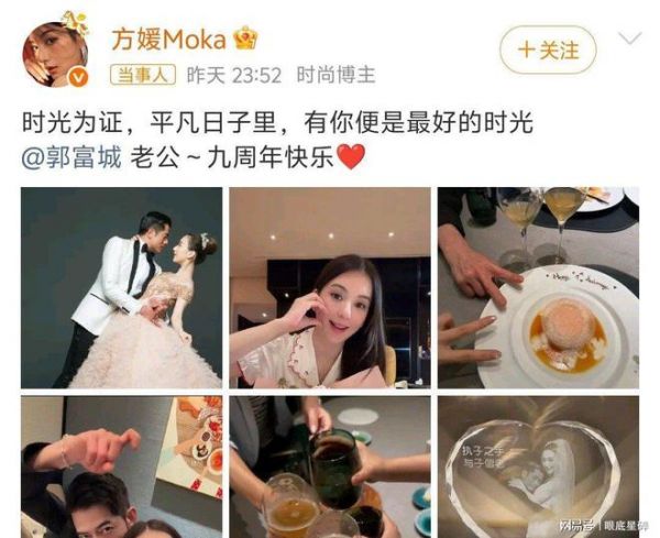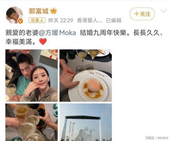4月18日,郭富城、方媛迎来结婚9周年,双双晒照撒糖