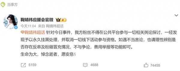丝芭总裁王子杰去世的消息登上热搜后,鞠婧祎后援会发出声明,要求粉丝不得在任何场合以任何言论讨论此事,否则将永久挂黑,并且永久取消一切线下活动参与资格,并哀悼逝者。