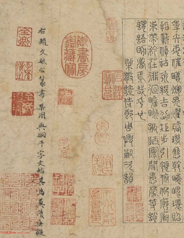 赵孟頫(公元一二五四-一三二二年),字子昂,宋皇室之后裔。诗文书画俱精,倡导复古,堪称元代艺坛领袖。此卷卷末虽有赵孟俯款及其钤印四方,然篆字结字松散,笔力软弱,缺乏赵字之稳重雅致,且赵氏印皆伪,当是后人托名仿作。唯卷末有项元汴跋云「右赵文敏公篆书。梁周兴嗣千字文帖。其为真迹无疑。」等语,而本幅右下则有千字文第四九五「槐字号」编序,曾入藏项氏天籁阁。