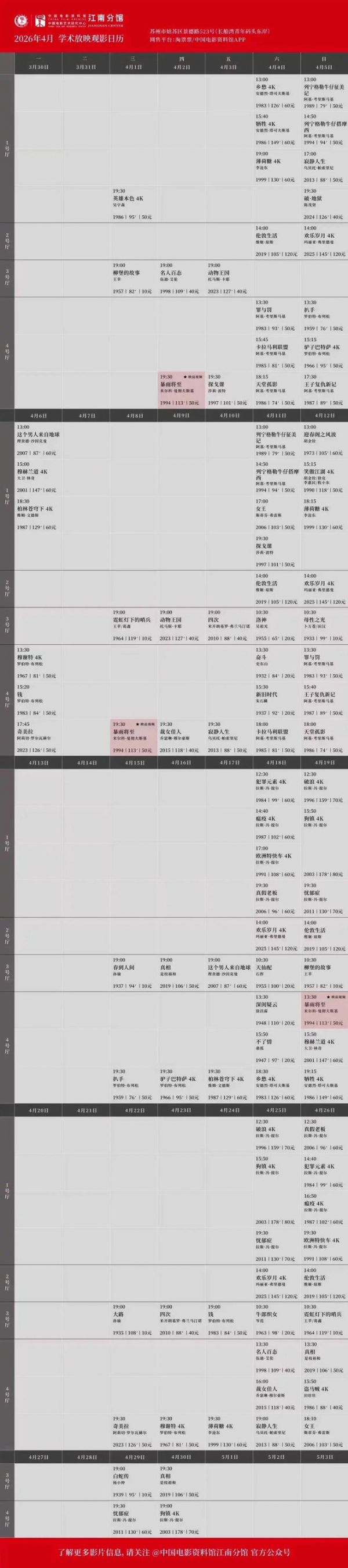 苏州江南分馆今日正常放映。4月27日预计公布5月片单,29号开票。五一五天乐,敬请期待。北京5月放映将在4月28日公布,30日开票。北影节结束后,小西天艺术影院进入北京大学生电影节展映环节,一直将持续放映至5月4日,优惠票价10元一场。