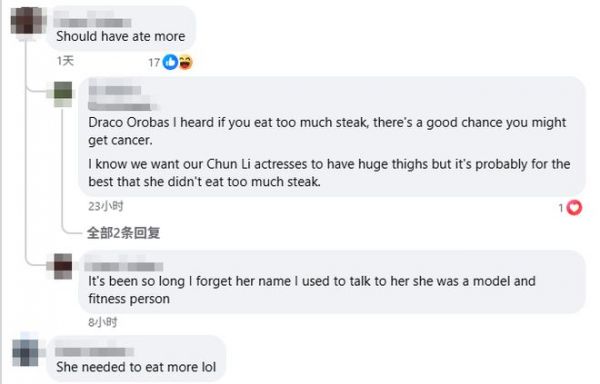 另一方面,也有评论对演员的健康表示担忧。有粉丝指出,过量食用红肉可能存在健康风险,称“我知道我们都希望演春丽的女演员有大粗腿,但她没吃太多牛排可能是最好的选择”。