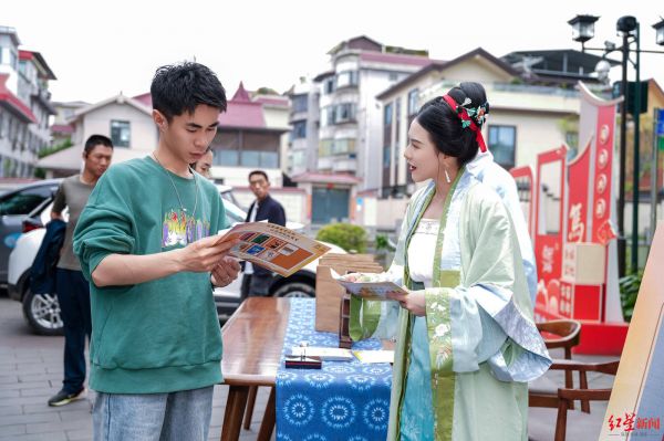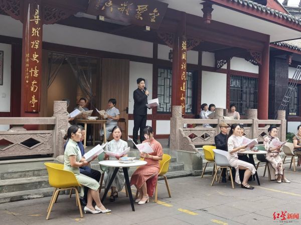 名家书籍阅读区集中展示了新都两届杨升庵文学奖获奖作品、《杨升庵》主题纪录片宣传展板及本土优秀文艺创作成果,核心展陈为中国作协九届十届全国委员会委员,著名作家侯志明,中国作协副主席、四川省作协主席阿来经典著作,以及新都区两届杨升庵文学奖获奖作品。诗词文化阅游互动体验区互动性最强,特邀演员身着古装,角色扮演杨升庵、李清照等古今诗词名家,在现场巡游互动,与市民开展诗词对答、飞花令、经典共读等趣味体验。