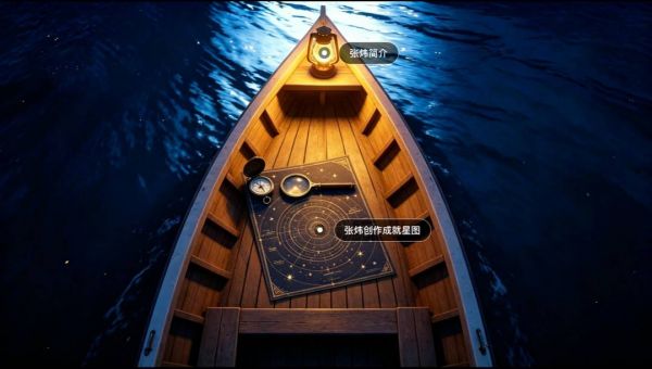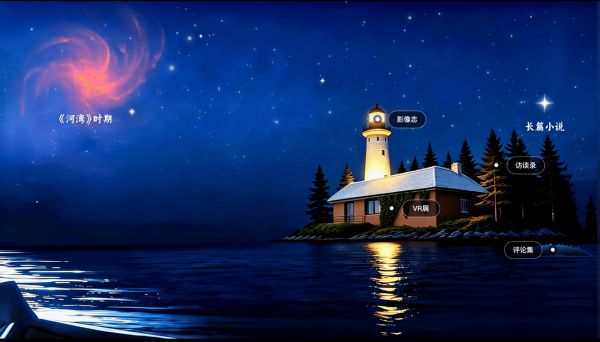 进入空间,乘一苇夜航船,穿行于深蓝流光的海面和星河璀璨的星云间。船头灯火摇曳,交互点击便可展开张炜的个人简介;船身铺展的复古星图,是张炜文学成就缩影,以时间为脉络,轨道上的每一颗星星,都对应着他创作生涯中的关键节点,让读者得以直观纵览他的文学征程。