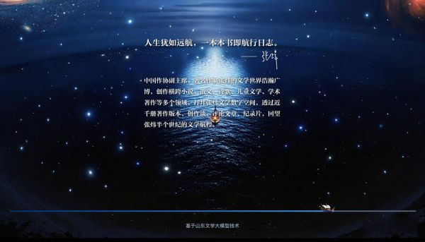 作为山东文学大模型可视化产品开发的首个重磅成果和国内首个文学名家数字空间,它打破传统模式,将数字空间与文学内容深度绑定的同时,把静态的内容文本数据转化为动态可感的数字美学空间,构建了一个沉浸式、可触摸的文学世界,让海量的文学作品、史料、评论、影像触手可及,化作一片可以漫步的数智星空、一艘可以登临的“夜航船”。