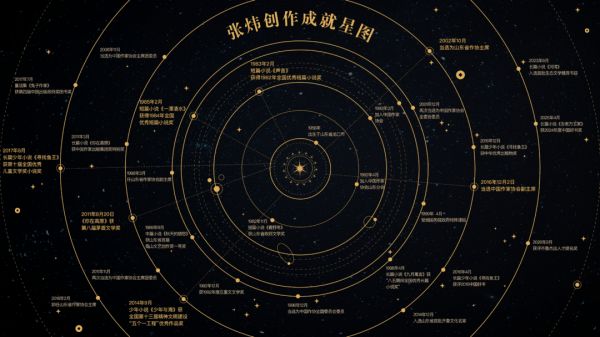抬头仰望,夜空中有多片星云缓缓流动,那是张炜创作生涯中最重要的五个时期:芦青河时期、《古船》时期、《九月寓言》时期、《你在高原》时期、《河湾》时期。点击任意一片星云,创作背景、风格与核心作品清晰呈现;点击其中一本著作,还能看到出版时间、字数、出版社、不同版次详情等完整信息。