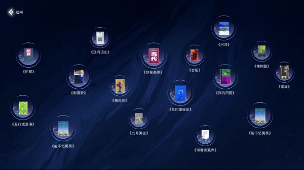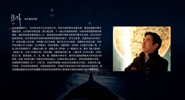 夜空中闪烁的点点繁星,涵盖长篇小说、中短篇小说、散文、儿童文学、诗歌、文集/文丛等几大体裁近千部作品的版本图录,点击星星,作品封面便会以动态飘动的形式呈现,轻点即可查看图书简介、出版信息等详细介绍,呈现了张炜的个人完整出版史。