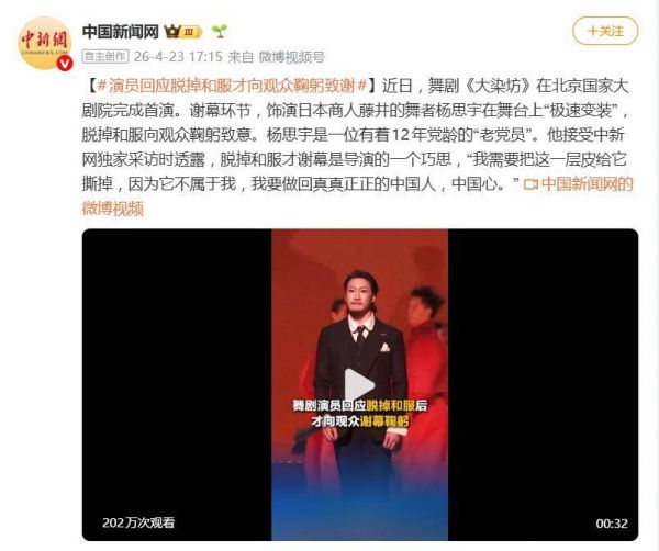 面对突如其来的全网关注,杨思宇本人也很快作出了回应。他在接受中新网独家采访时透露,这个“脱和服谢幕”的巧思其实来自导演。“我需要把这一层皮给它撕掉,因为它不属于我,我要做回真真正正的中国人,中国心。”杨思宇解释道,导演希望在谢幕时完成一个从戏里到戏外的身份转变,通过剥离和服回到演员本身,向观众表达更真挚的情感与感谢。