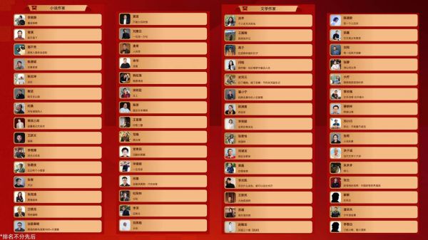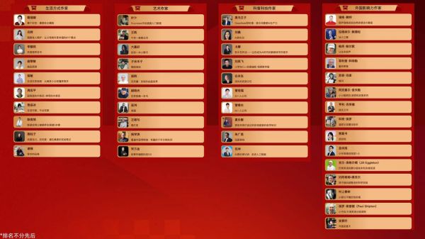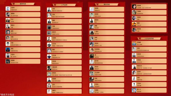 本届评选涵盖的19个榜单。在文学作家领域,李筱懿、刘同等作家凭借丰沛的文学创作再次入选。青年作家榜则涌现出卢思浩、张皓宸、千山茶客等备受年轻读者喜爱的优秀创作者。在人文社科作家领域,著名文化学者余秋雨、施一公、梁鸿、鲍鹏山等学者入选。财经作家榜单中,知名作家冯唐跨领域入选。