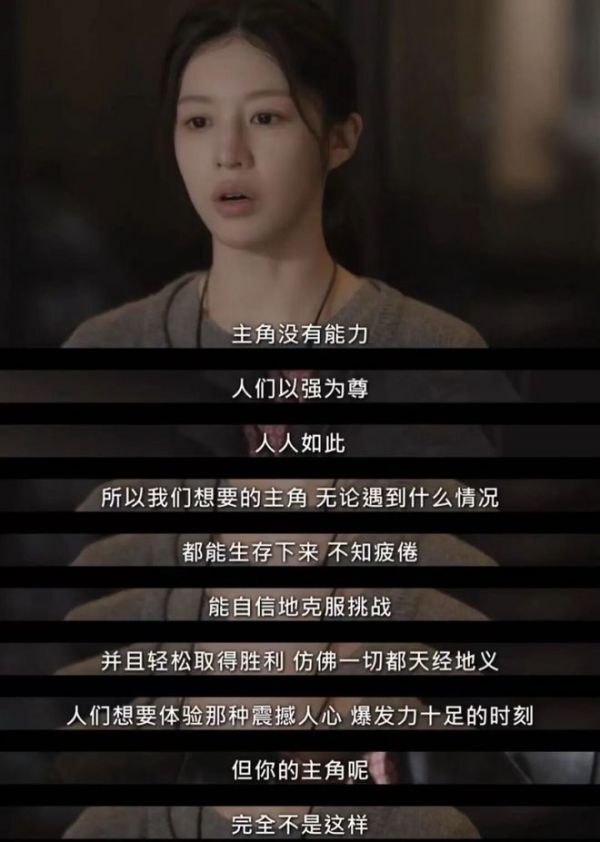 “人们以强为尊,人人如此,所以我们想要的主角,无论遇到什么情况,都能生存下来,不知疲倦,能自信地克服挑战,并且轻松取得胜利,仿佛一切都天经地义。人们想要体验那种震撼人心,爆发力十足的时刻。但你的主角呢?完全不是这样。你应该创造一个有能力的人,为什么你没有?因为作者本身也没有能力,一个创造者,无法创造出自己不具备的东西。”