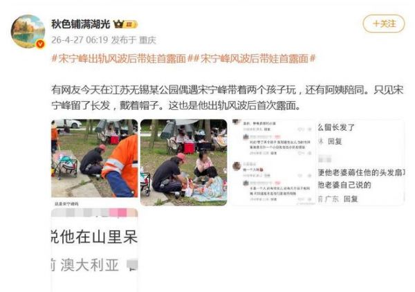 “出轨风波”后沉寂了近一个月,演员宋宁峰终于有了新动静。据4月27日网友爆料,有网友在江苏无锡蠡湖公园偶遇他带着两个孩子游玩,这也是他自3月底被曝婚内出轨后首次公开露面。