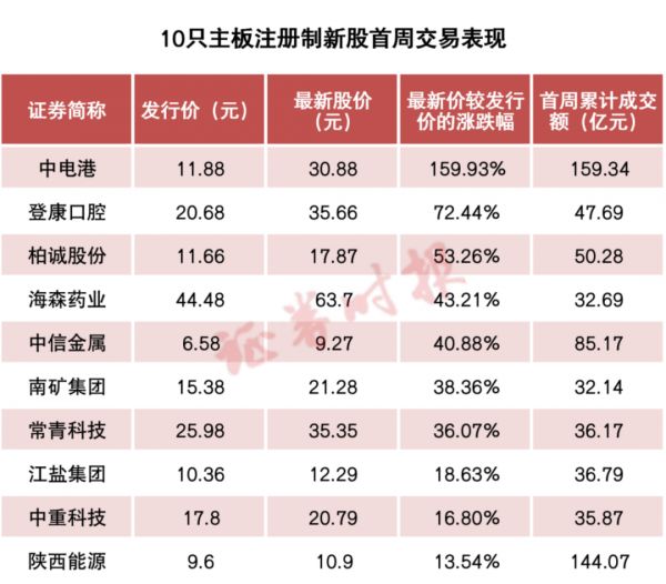 根据相关交易新规,主板注册制新股上市前5个交易日不设涨跌幅限制,上述10只新股首周交投活跃。