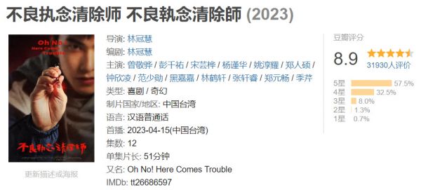 在豆瓣平台,《不良执念清除师》的最新评分为8.9分,五星好评占比最高,约为57.5%,是最近口碑最好的华语剧集之一,评分仅次于《漫长的季节》,又一部惊艳非凡的华语佳作诞生。