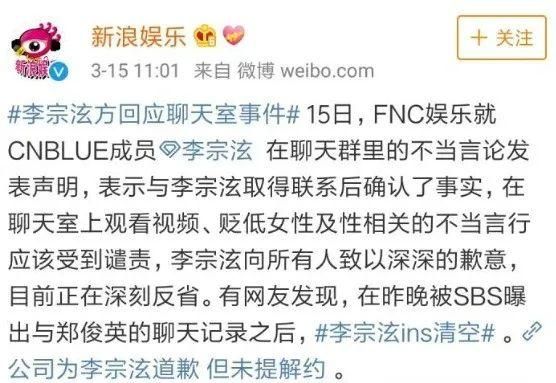 Cnblue成员李宗泫在聊天群公然询问有没有漂亮女孩拿来玩耍。